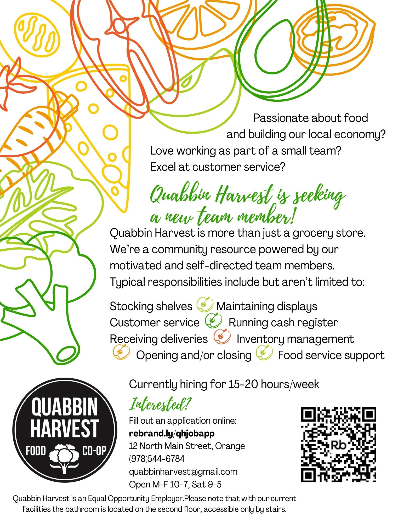 Quabbin Harvest is an Equal Opportunity Employer.Please note that with our current facilities the bathroom is located on the second floor, accessible only by stairs.